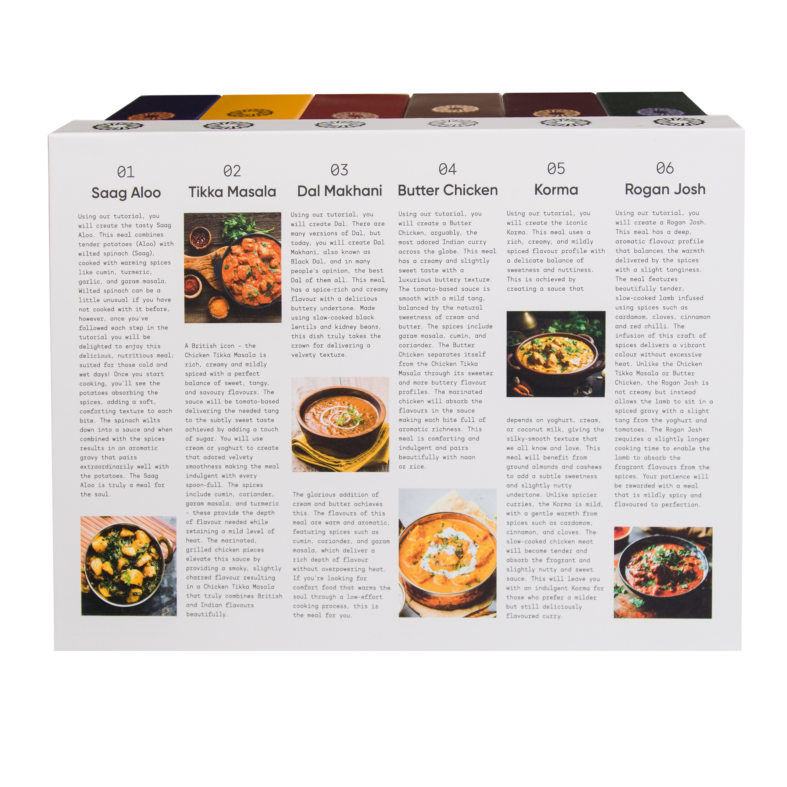 The India - Series One comprises six iconic Indian meals. Within each box is a spice sachet, containing the necessary spices blended and balanced to aromatic perfection.